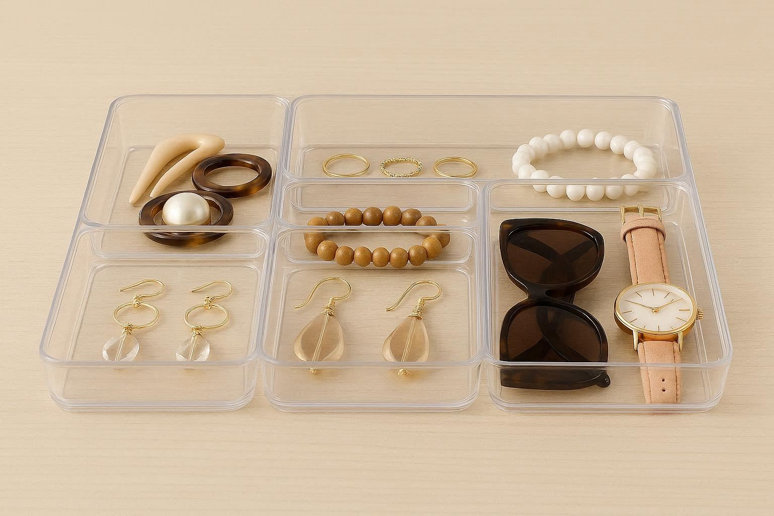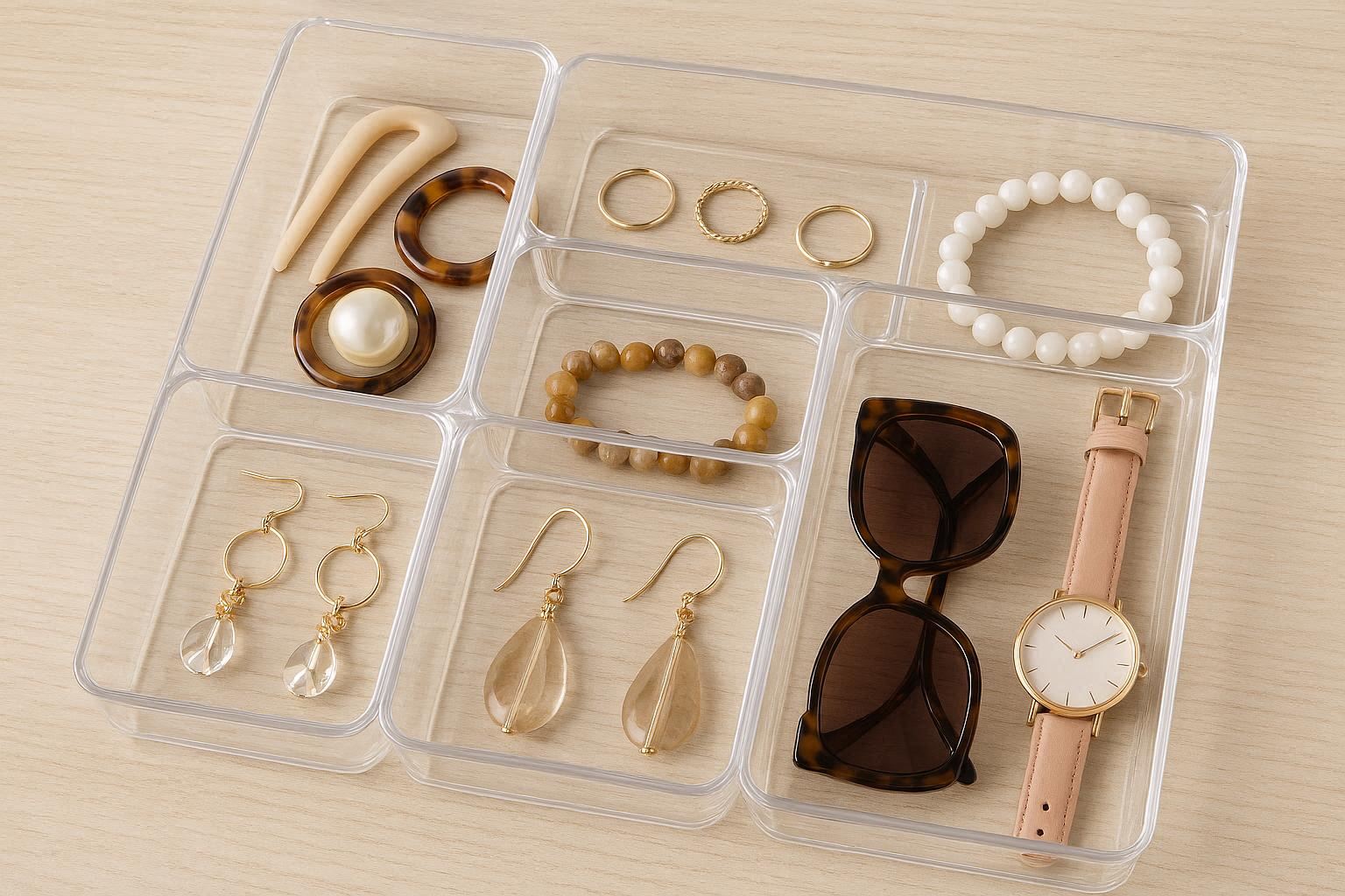 These clear plastic drawer organizer inserts are specifically designed to bring order to bedroom drawers containing jewelry, watches, sunglasses, and small accessories. Made from high-quality, shatter-resistant acrylic, they offer crystal-clear visibility of all contents. The set includes a variety of compartment sizes, from small ring slots to larger sections for bracelets or scarves, allowing for a fully customized organization system.