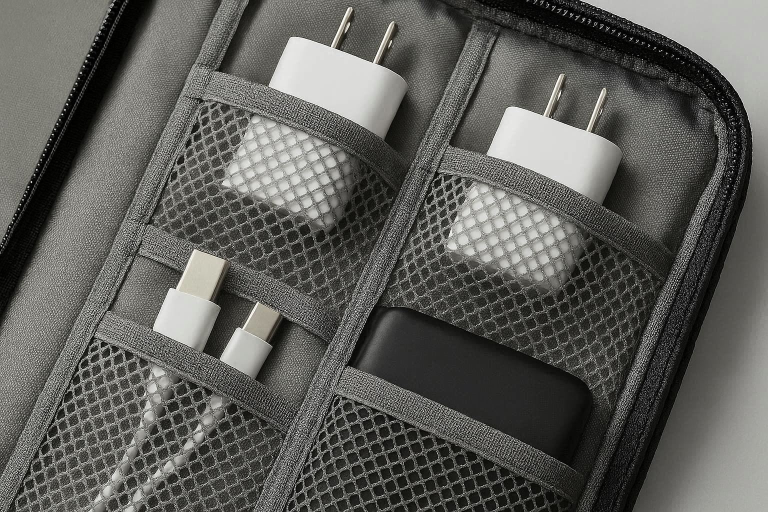 The interior is meticulously organized with multiple elastic loops of varying sizes to hold power banks, pens, and USB sticks, along with zippered mesh pockets for smaller items like SD cards or SIM tools. Two large, padded sleeves can safely hold a tablet or a small laptop, and numerous elastic cord managers keep every cable neatly coiled and separated.