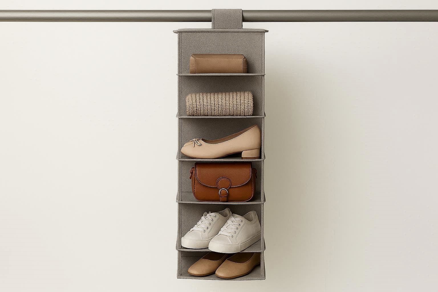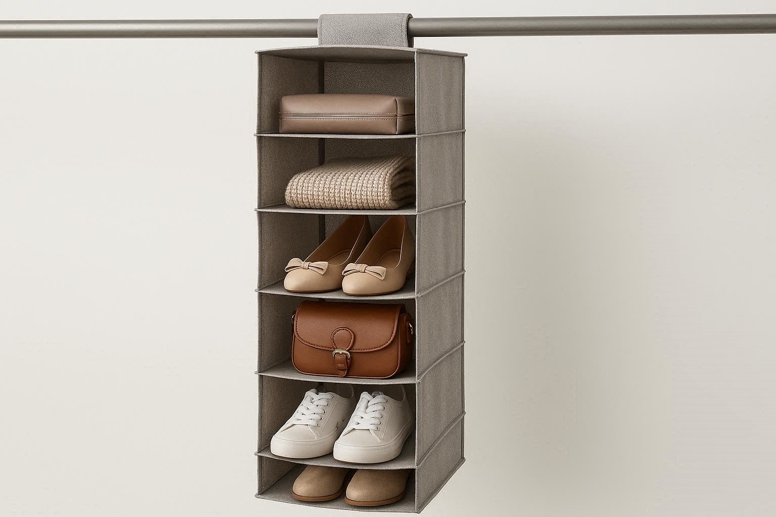 This organizer instantly doubles your closet storage capacity without requiring additional floor space. It’s perfect for organizing shoes, purses, folded jeans, or children’s clothing in a neat, vertical system. An excellent solution for small apartments, dorm rooms, or anyone looking to maximize their closet’s potential.