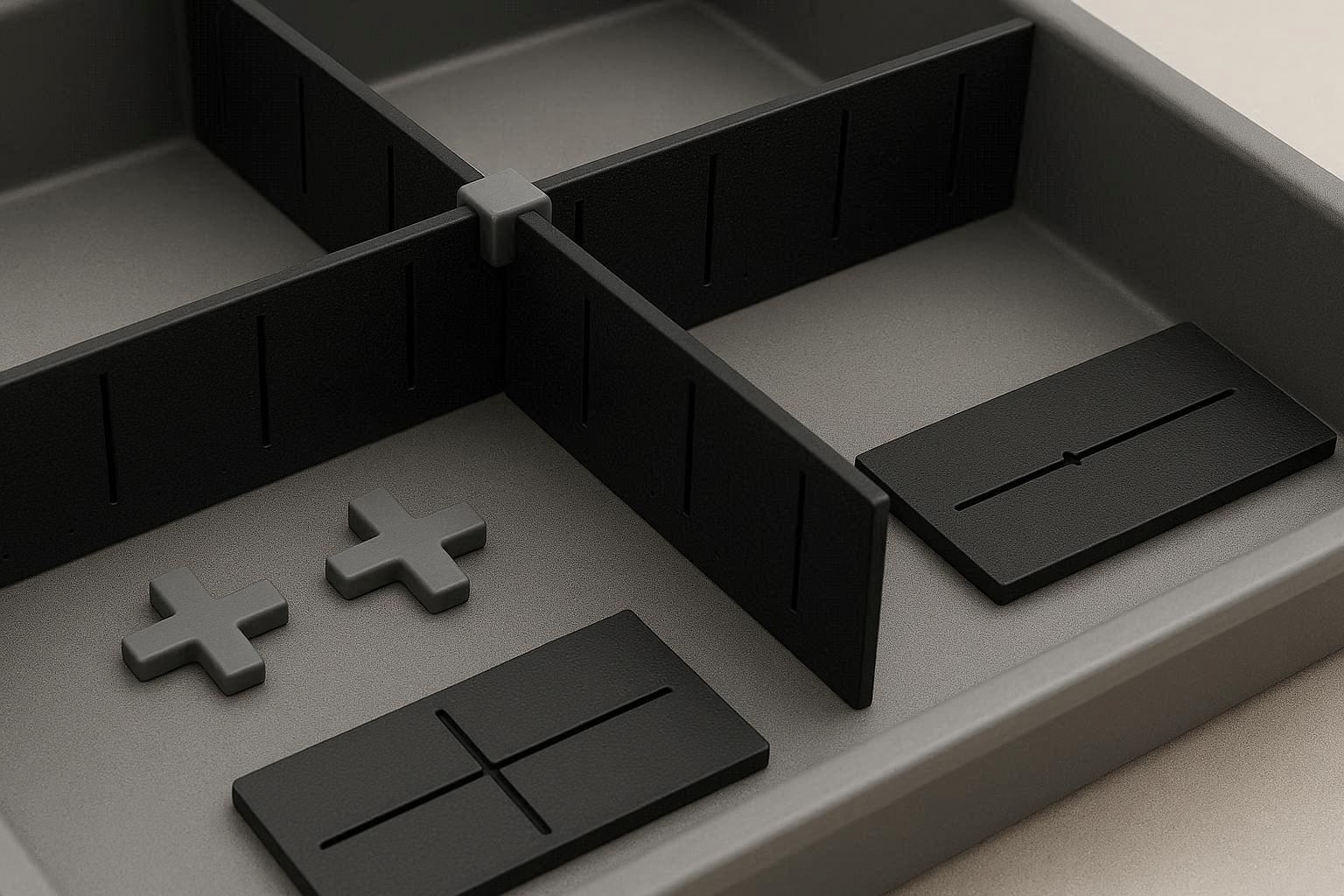 This heavy-duty modular divider system is engineered for workshop and garage drawers, allowing for the complete customization of tool storage. The dividers are constructed from impact-resistant ABS plastic and feature a grid of connection slots along their lengths. Using the included plastic connectors, you can build an endless variety of compartment shapes and sizes to securely hold wrenches, screwdrivers, sockets, and other hardware.
